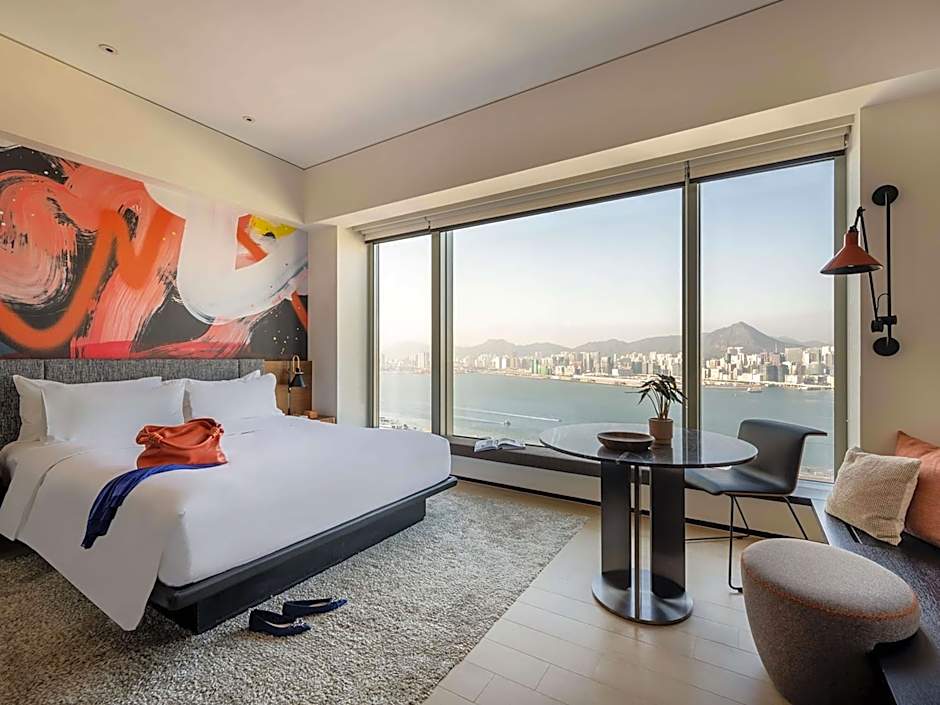 Large windows overlook the beautiful Victoria Harbor and Eastern Kowloon city skyline. Room features an interactive (available in selected rooms only) and a walk-in rain shower. Also includes an espresso machine and a selection of teas and infusions.